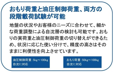 グラウンド・プロは人間の動作に近く、自然荷重の状態を再現することで、手動式と同等の高精度な調査が可能で、軟弱地盤に対して適切な評価ができます。≪段階積荷貫入試験(自沈層の計測)≫