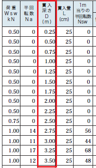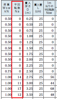 こちらは1層ごとのロッド回転数です。地盤調査の回転数は半回転でカウントするので、画像内にある14,11,17,12の数字を2で割ると1回転の数値になります。